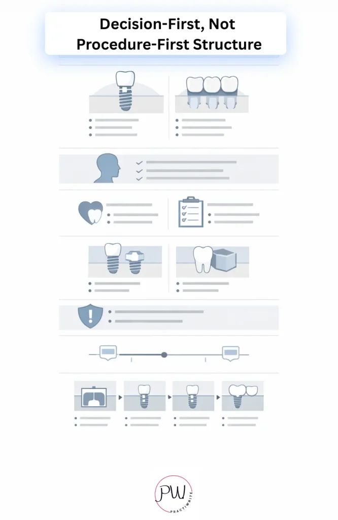 Lead with the decision the patient is weighing, not the procedure steps. Show your clinical philosophy, specify the implant systems you use and why, give a real pricing range, and describe who is and isn’t a good candidate. The procedure walkthrough belongs further down the page, not at the top.