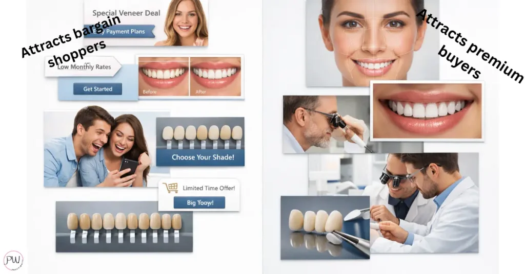 Every one of those phrases signals PPO shop. The veneer patient you want reads those and closes the tab.