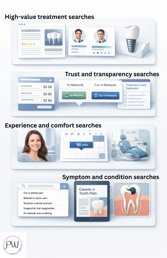 What fee-for-service dental patients are searching for is fundamentally different from what a PPO patient is searching for. That difference isn’t subtle. It changes the keywords you target, the questions you answer, the tone you use, and the content types you prioritize.